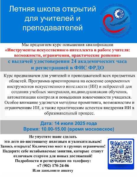 Летняя школа для учителей школ, преподавателей вузов, СПО Курс повышения квалификации «Инструменты искусственного интеллекта в работе учителя: возможности, ограничения, практические решения» с выдачей удостоверения 24 академических часа и регистрацией в ФИС ФРДО Курс повышения квалификации «Профессиональная компетентность педагога в научно-методической публикационной деятельности» с выдачей удостоверения 24 академических часаКурс повышения квалификации "Эффективная проектная деятельность. От идеи до гранта и победы в конкурсах" с выдачей удостоверения 72 академических часаКурс повышения квалификации "Мастерская Кооперативного обучения. Методики и приемы для современного урока" с выдачей удостоверения 72 академических часа